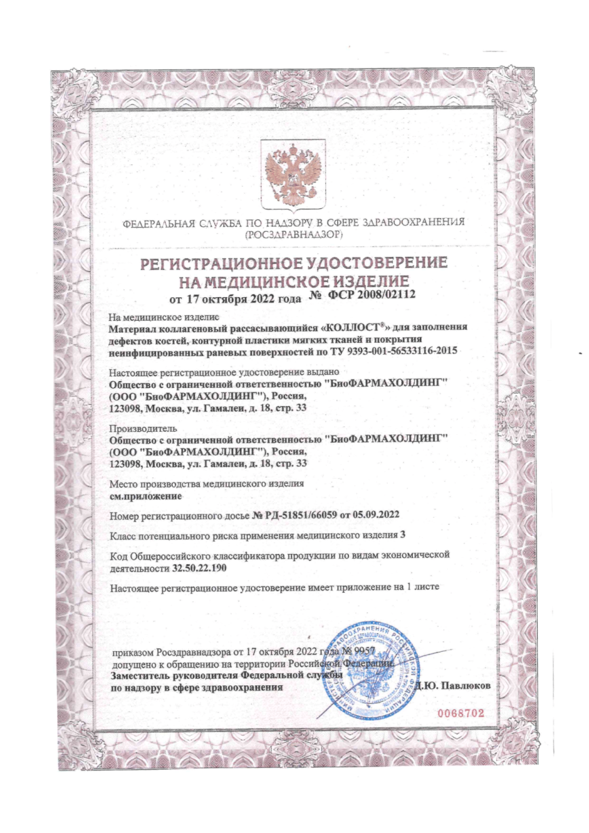 Материал коллагеновый рассасывающийся "КОЛЛОСТ"-гель 7%, 1,5 см3